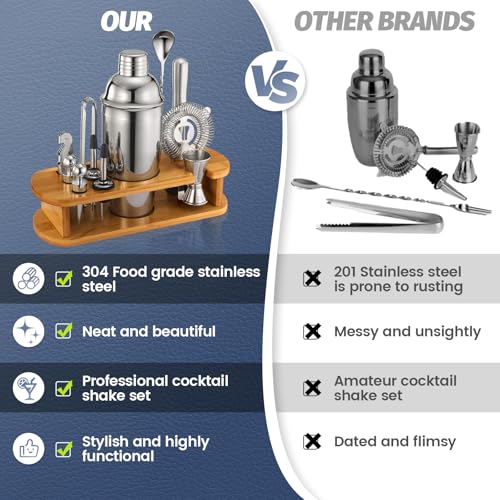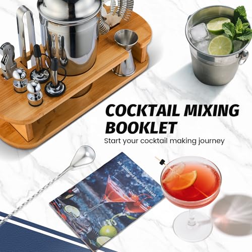 Master mixology with this 13-Pcs Cocktail Shaker Set. A complete bartender kit with a bamboo stand, including a 25oz martini shaker, jigger, bar spoon. Essential bar accessories & professional cocktails kit for home drink mixing.