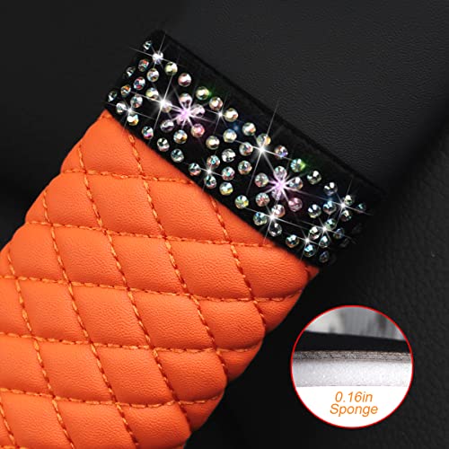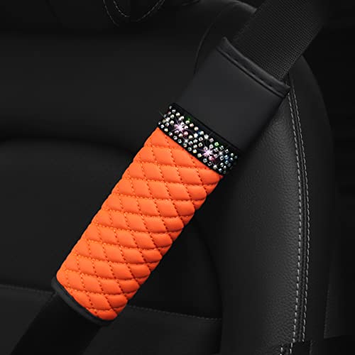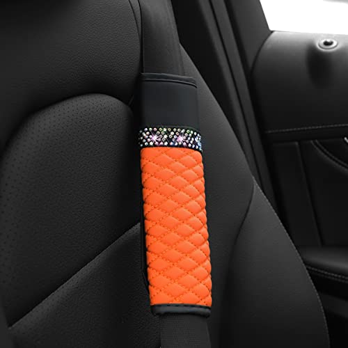 Orange breathable leather shoulder pads for car seat belts. Protects neck & enhances driving comfort for adults and kids.