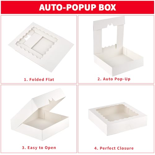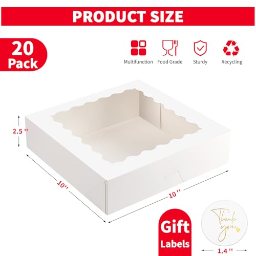 20-pack white 10x10x2.5 inch bakery boxes with window. Auto-popup design for easy assembly. Perfect for pies, cookies, donuts, and pastries.