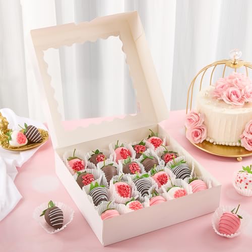 These convenient 10 x 10 x 2.5 inch bakery boxes come in a 20-pack and feature an auto-popup design for quick and easy assembly. The clear window allows for an attractive display of your delicious treats like chocolate-covered strawberries, cocoa bombs, donuts, muffins, and pastries. Ideal for home bakers, parties, or small businesses.