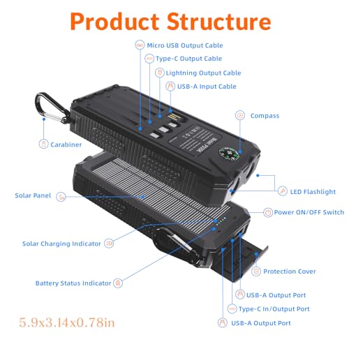 20000mAh solar power bank with 4 built-in cables, USB-C. Outdoor waterproof portable phone charger with dual flashlight for camping.