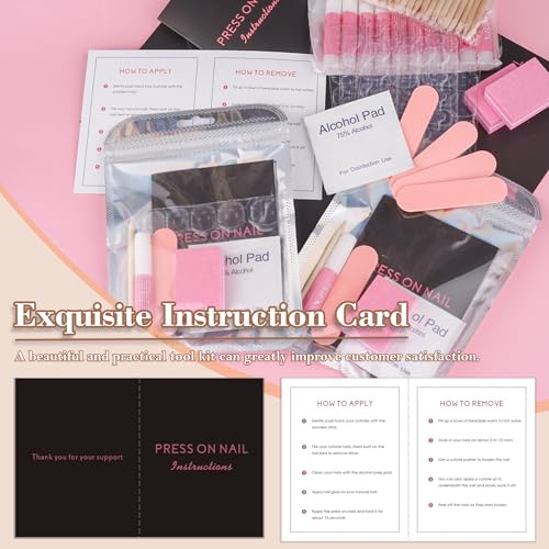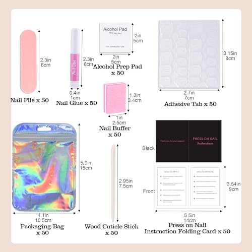 Optimize your salon or press-on nail business with this comprehensive 50-set disposable manicure prep kit. Each individual kit provides all the essential tools for a perfect press-on nail application: a nail file, buffer, nail glue, prep pad, instruction card, adhesive tabs, and a wood stick, all neatly packaged in a holographic bag. Designed for hygiene and convenience, these kits ensure a professional, long-lasting finish for every client. Ideal for new businesses, mobile nail technicians, or established salons looking to streamline their press-on nail services and enhance customer experience.