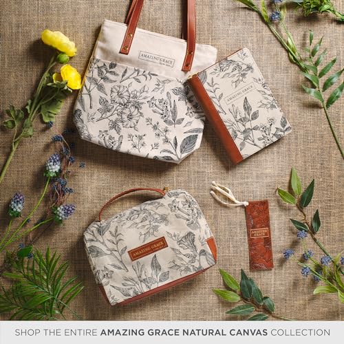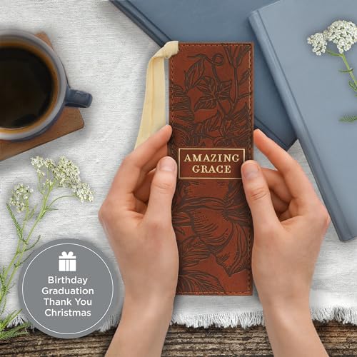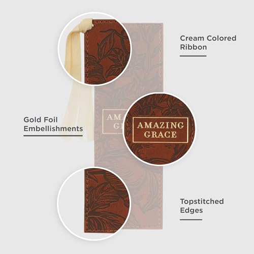 Inspire your reading with this ‘Amazing Grace’ vegan leather bookmark for women. Features a heat-embossed floral design and canvas ribbon, a faith-based accessory.