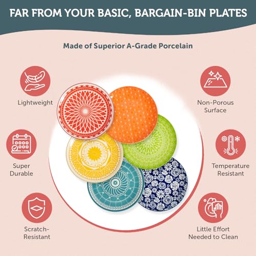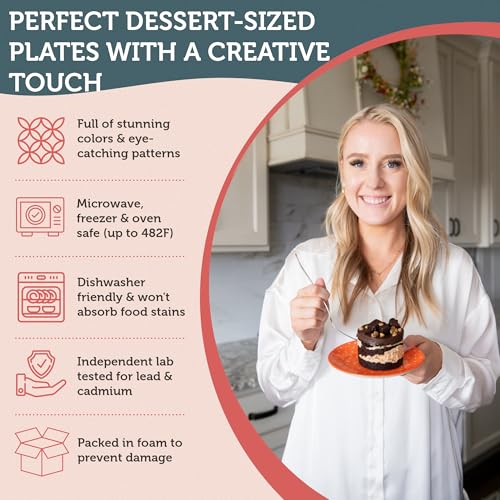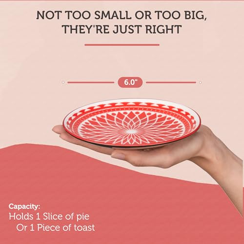 Set of 6 vibrant 6-inch porcelain dessert plates for appetizers, cakes, snacks & cocktails. Microwavable, zero lead & cadmium. Perfect decorative mini saucers.