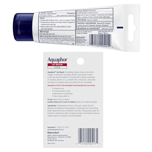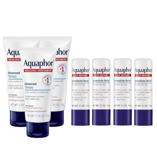 Combat dry, cracked skin and chapped lips with the comprehensive Aquaphor Skin Care Set. This essential bundle includes three 1.75 oz tubes of Aquaphor Healing Ointment, a dermatologist-recommended solution for soothing and protecting severely dry skin, minor cuts, and burns. It also features four 0.17 oz Lip Repair Sticks, offering immediate relief and long-lasting moisture for chapped lips. Together, these multi-purpose products provide intensive care, restoring smoothness and health to your skin and lips, making them perfect for year-round hydration and protection.