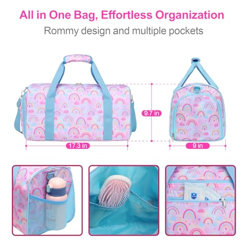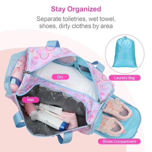 This Bagseri Kids Duffel Bag is designed for active girls. It’s a versatile, waterproof bag ideal for dance, ballet, gymnastics, sports, and overnight travel. The innovative design includes a separate shoe compartment to keep dirty shoes isolated and dry/wet separation pockets for swimwear or sweaty gym clothes. The light purple blue rainbow design adds a fun, vibrant touch. Durable and practical, it’s perfect for young adventurers.