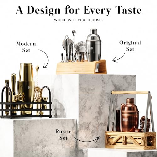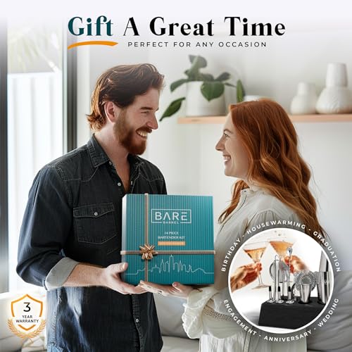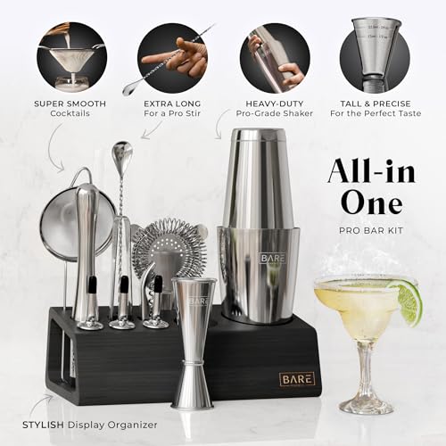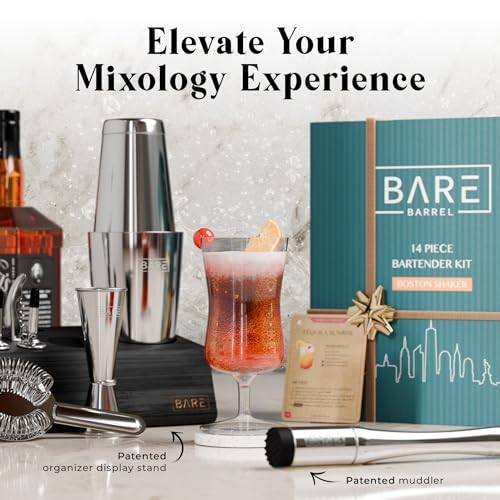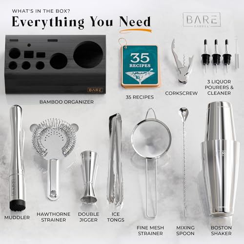 Elevate your home bar with the BARE BARREL 14-Piece Mixology Bartender Kit. This comprehensive cocktail shaker set includes all essential barware mixing tools, featuring a 28oz Boston shaker. Ideal for crafting martinis and a variety of cocktails. Comes with 35 recipe cards to inspire your mixology journey. A perfect gift for aspiring bartenders and cocktail enthusiasts, in a sleek silver/black finish.