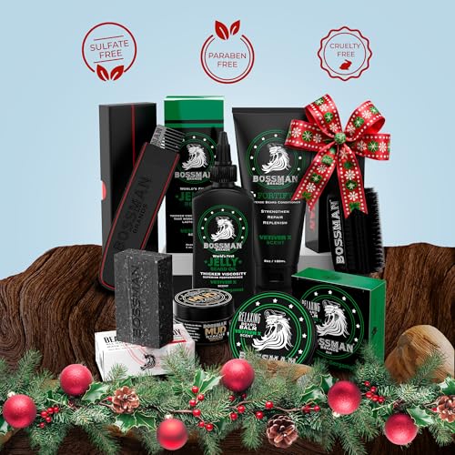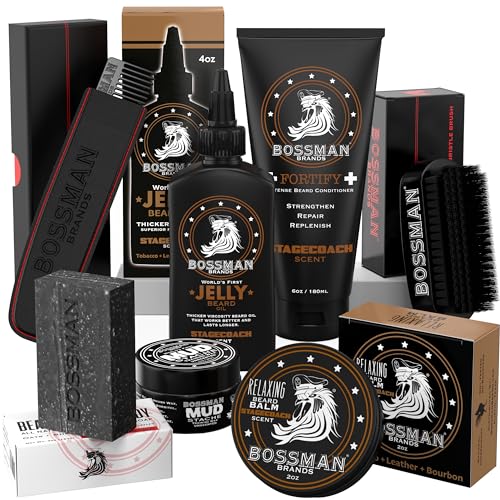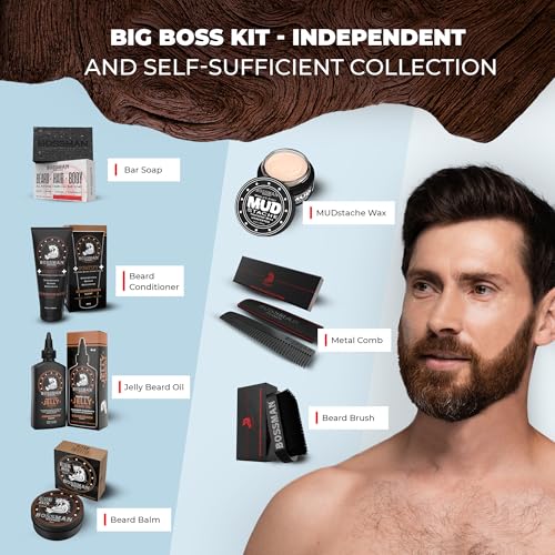 Achieve a majestic beard with the Bossman Big Boss 7-Piece Beard Care Kit. This ultimate grooming collection includes Jelly Beard Oil, a hydrating conditioner, shaping beard balm, MUDstache wax for styling, a cleansing bar soap, a durable metal comb, and a premium beard brush. Infused with the rugged Stagecoach scent, this kit deeply nourishes, styles, and maintains your beard, leaving it soft, strong, and impeccably groomed. The perfect gift for any man serious about his beard.