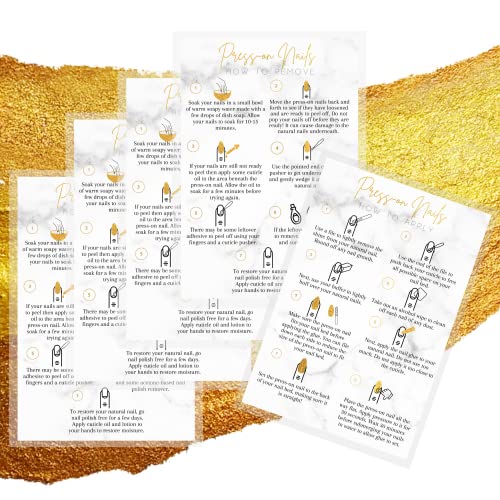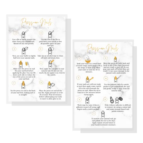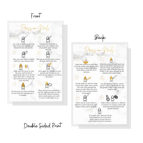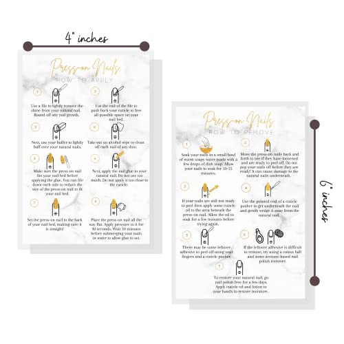 Elegant 4×6″ marble gold design postcard with press-on nail application and removal instructions. Perfect for boutique marketing & nail kit supplies.