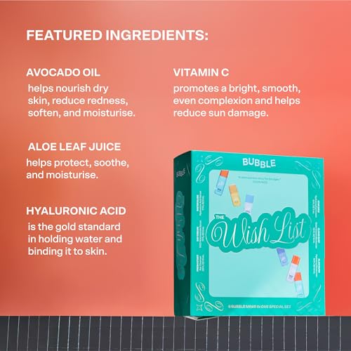 Fulfill your skincare wishes with the Bubble Skincare The Wish List Mini Skincare Essentials Gift Set. This 6-count collection features travel-size versions of Bubble’s popular products, including a refreshing gel cleanser, a potent Vitamin C & Hyaluronic serum, a brightening eye cream, a hydrating water cream, and a nourishing face moisturizer. Perfect for trying new products, gifting to skincare enthusiasts, or maintaining your routine on the go. Achieve a healthy, glowing complexion with these essential skincare heroes.