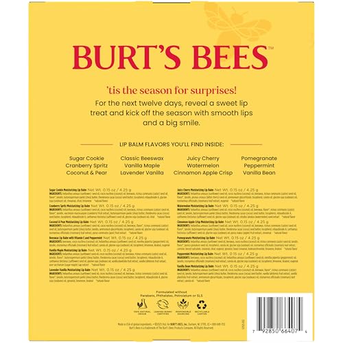 Unwrap joy this holiday season with the Burt’s Bees 12 Days of Joy Lip Balm Advent Calendar Gift Set. This festive collection features 12 unique, natural origin, tint-free flavored lip balms, each designed to deeply moisturize and soothe your lips. Ideal for sharing holiday cheer at the office or gifting to friends and family, this set offers a delightful surprise every day. Enjoy long-lasting hydration and a variety of delicious scents, making it a perfect daily lip care essential.