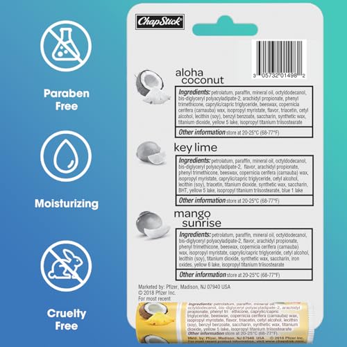 Indulge in ChapStick’s 5-piece Tropical Paradise Lip Care Bundle: Mango Sunrise, Key Lime, Aloha Coconut. Exotic flavors for smooth, moisturized lips.