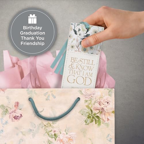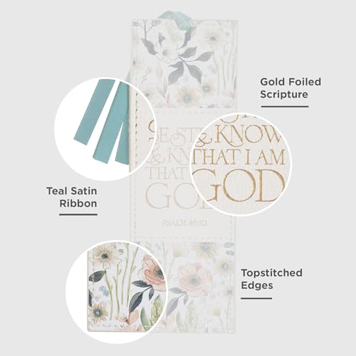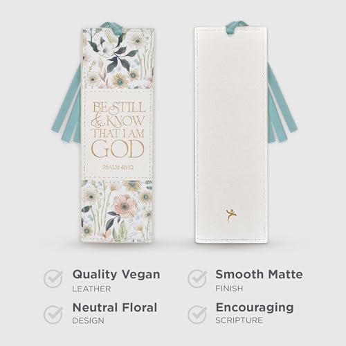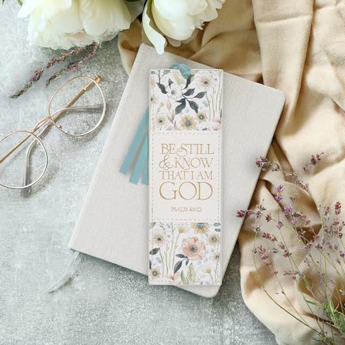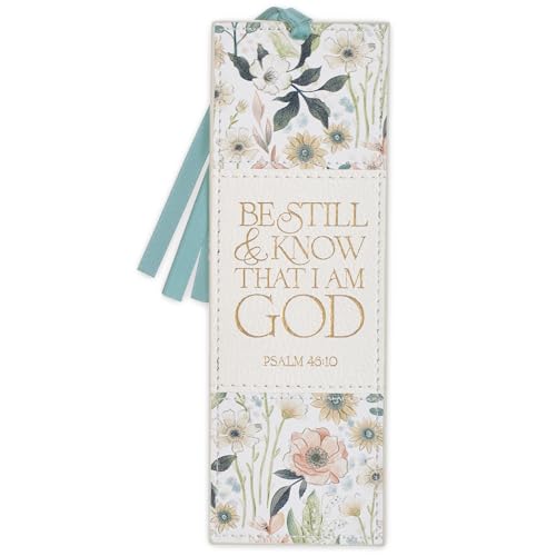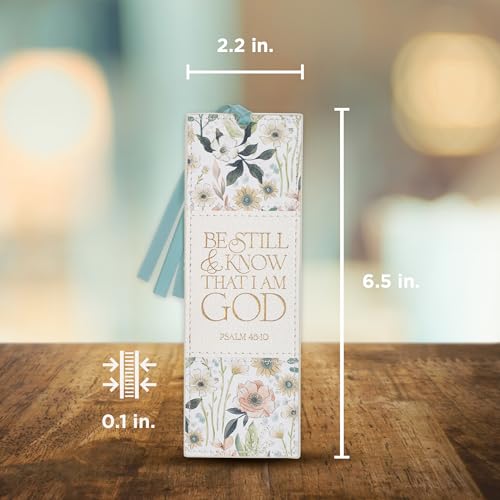 Elevate your reading experience with this beautiful Christian Art Gifts vegan leather bookmark. Featuring an inspiring “Be Still & Know” scripture in elegant gold lettering and a lovely white multicolor floral design, it’s perfect for marking pages in your Bible, devotionals, or favorite books. The attached blue satin ribbon adds a touch of sophistication. A thoughtful and durable gift for women who cherish faith and reading.