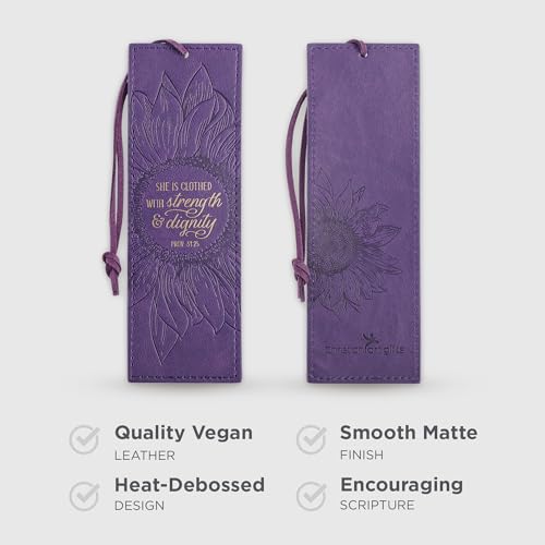 Elegant vegan leather bookmark for women featuring Proverbs 31:25. Heat-debossed scripture with a purple sunflower design and tassel. Perfect faith-based gift.