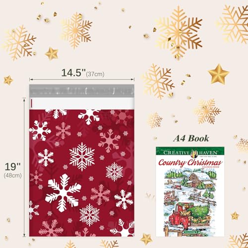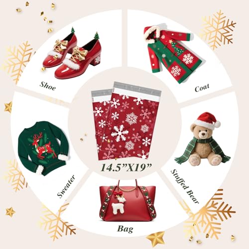 Festive Christmas poly mailers for clothing & small businesses. Strong adhesive, self-seal, waterproof shipping envelopes. 50 large 14.5×19 inch red snow bags.