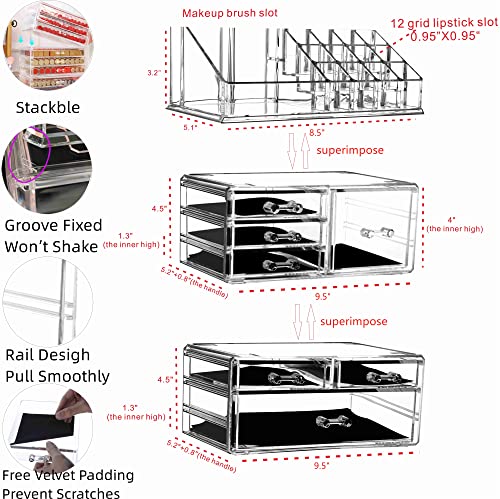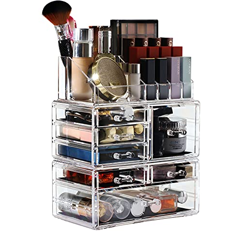Organize your vanity with this clear acrylic makeup organizer. Features 7 stackable drawers & brush holder for skincare, jewelry, lipsticks, and nail polishes.