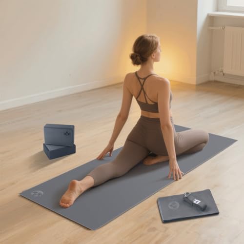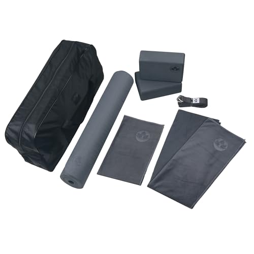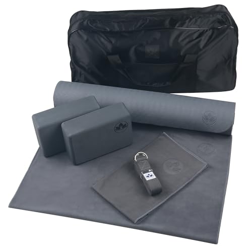 Complete 7-piece yoga kit for men & women: 6mm non-slip mat, 2 foam blocks, 8ft strap, microfiber towels & carrying bag. Perfect for home workouts.