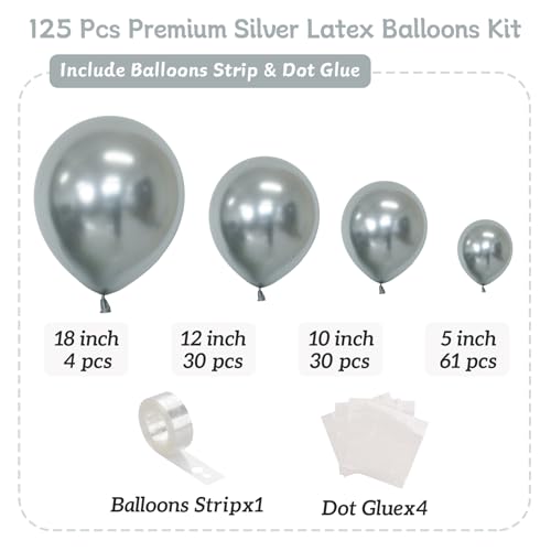 The kit contains 125 silver metallic balloons in various sizes, ideal for creating a full balloon arch.