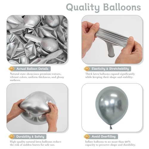 Create stunning silver balloon arches with this 125-piece kit. Features metallic balloons in various sizes for birthdays, weddings, graduations, baby showers & more.