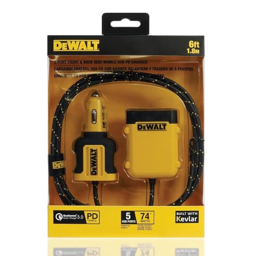 The DEWALT Heavy Duty 72W 5-Port USB Car Charger is built for robust performance, perfect for power users and families on the go. This multiport adapter features Power Delivery (PD) and Quick Charge 3.0 (QC3.0) technologies, ensuring rapid charging for iPhone 16 and a variety of other devices. With Type-C ports for both front and back seat charging and an included 6ft cable, everyone can stay powered up. Its heavy-duty design makes it ideal for work vehicles or adventurous trips.