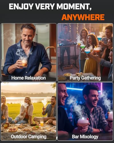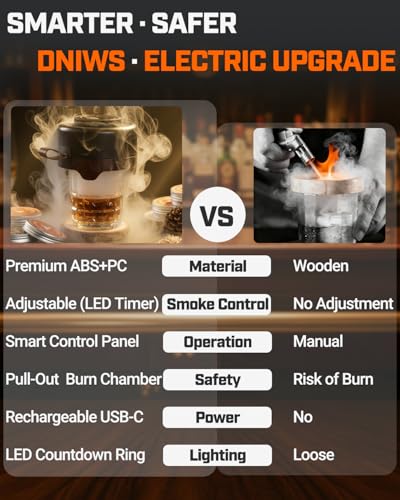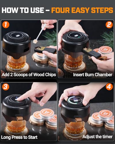 Enhance your drinks with an electric whiskey & cocktail smoker kit. Adjustable smoke, LED timer, rechargeable, 6 wood chips. Perfect bourbon gift for men.