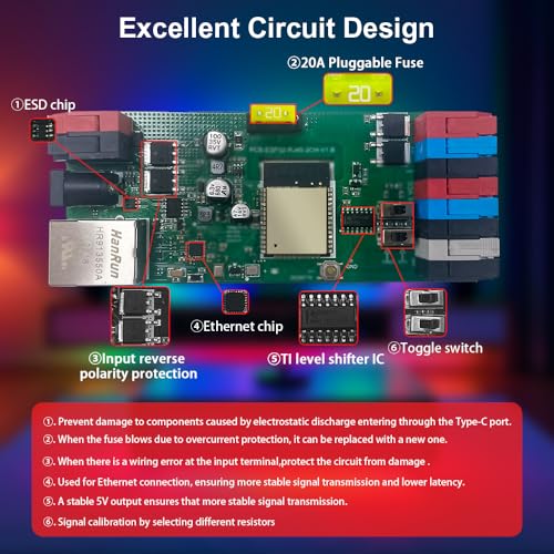 Unleash ultimate control over your digital addressable RGBIC LED strip lights with the Elite ESP32 WLED Controller. This advanced module features Ethernet connectivity for reliable network integration, alongside music and sound reactive capabilities for dynamic visual effects. Designed for DIY enthusiasts, it includes a UART energy-saving relay and a 20A pluggable fuse for enhanced safety and efficiency. Compatible with popular LED types like WS2811, WS2812, SK6812, and WS2815, it’s perfect for creating custom, high-performance lighting installations.