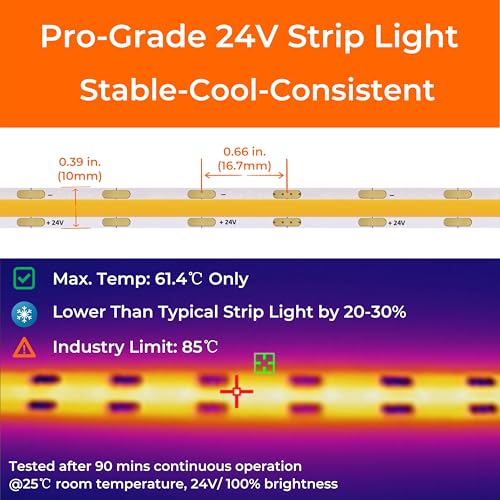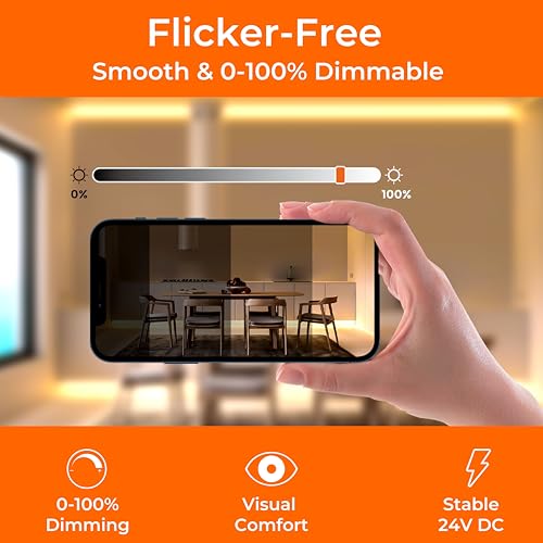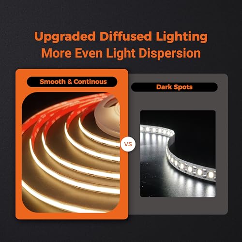 Experience superior lighting with FluFlux COB LED Strip Lights 3000K. These high-quality 24V DC LED tape lights deliver over 330 lumens per foot, providing bright, uniform illumination without visible dots. Featuring a strong VHB backing for easy installation, a high Color Rendering Index (CRI) of 95 ensures true-to-life colors. They are UL Listed for safety, cuttable and linkable for flexible customization, and fully dimmable to create the perfect ambiance. Ideal for various applications including bedroom accent lighting, under-cabinet lighting in kitchens, and illuminating cabinets. Please note, power supply is not included.
