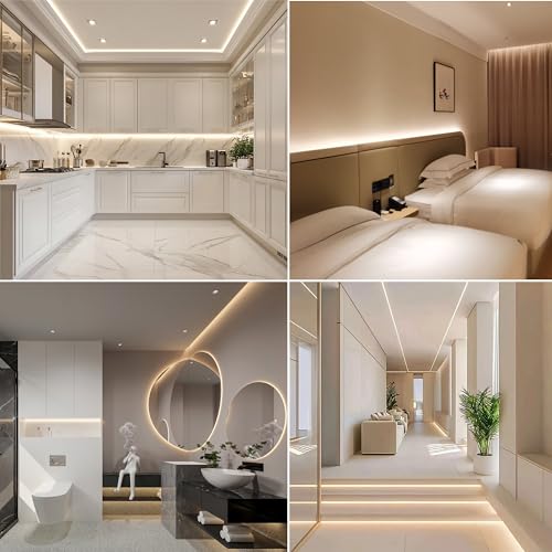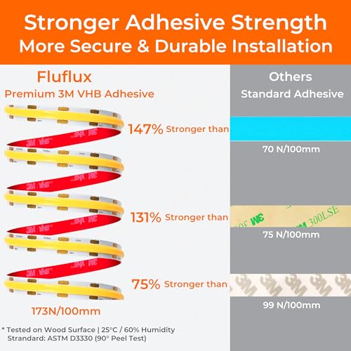 FluFlux COB LED strip lights (3500K) for premium diffused lighting. CRI 95, UL Listed, flexible, dimmable, with strong 3M VHB adhesive. Ideal for living rooms, stairs.