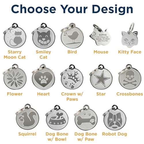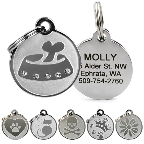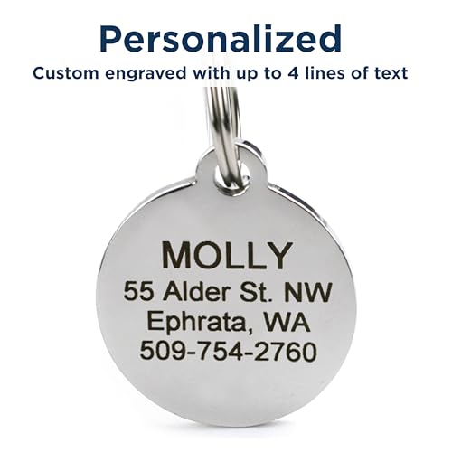 Personalized stainless steel pet ID tags for dogs & cats. Custom engraved with 4 lines of text. Durable, cute & unique designs for your beloved pet.