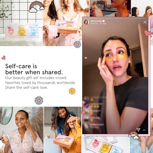 Award-winning Grace & Stella skincare set with gold eye masks, hyaluronic acid serum, & rose spray. Travel essentials for women & teen girls. Perfect Christmas gift!