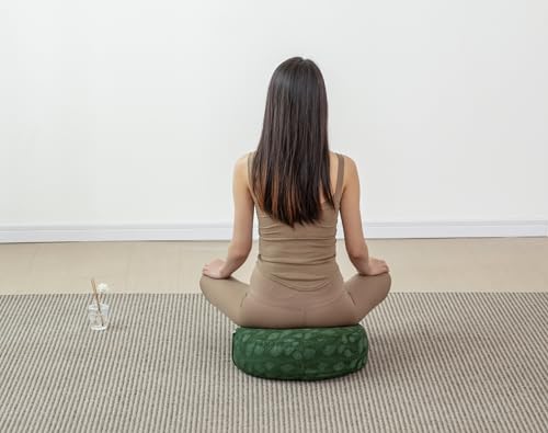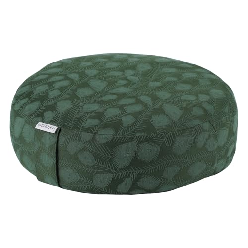 Halotribe comfortable Zafu meditation pillow (16x16x5 in) with beautiful Peacock Feather Jacquard cover. Buckwheat hull filled for optimal support & posture. Stylish floor seating.
