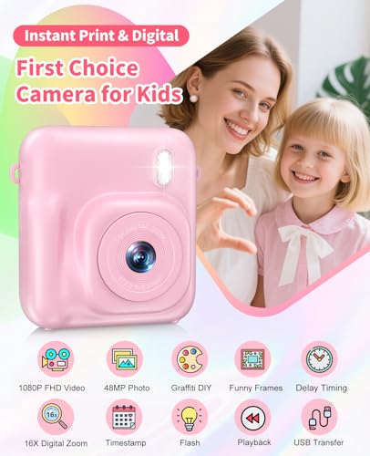 Empower young photographers with this pink instant print digital camera. Boasting a 48MP dual-lens system and 1080P video recording, it’s perfect for capturing every adventure. Kids can take selfies, print photos instantly, and enjoy creative filters. Portable and durable, it includes a 32GB SD card, making it an ideal gift for birthdays or Christmas for children aged 4-12 years.