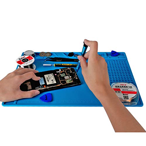 The Kaisi S-140 Magnetic Insulation Silicone Soldering Mat is an essential tool for any electronics repair enthusiast or professional. Measuring 13.8 x 9.8 inches, this mat offers superior heat resistance up to 932°F, protecting your workbench from soldering irons, heat guns, and other hot tools. Its integrated magnetic sections keep small components, screws, and parts organized and prevent loss during intricate repairs of phones, circuit boards, and other electronic devices. Enhance your efficiency and maintain a tidy workspace with this durable and practical soldering mat.