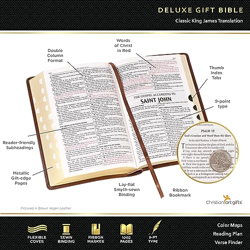 Experience the timeless beauty of the King James Version with this KJV Holy Bible, presented in a standard size with a durable medium brown faux leather cover. This elegant edition features red letter text, highlighting the words of Christ for easy identification and deeper study. A convenient thumb index allows for quick navigation to specific books, while a ribbon marker helps you keep your place. Ideal for personal study, church attendance, or as a thoughtful gift, this Bible combines classic translation with reader-friendly features for an enhanced spiritual journey.