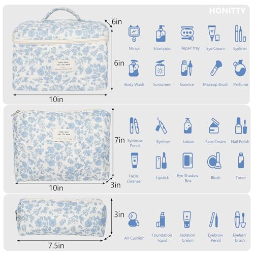 Stylish large floral quilted cotton makeup bag set for women. Perfect travel toiletry bag to organize cosmetics and beauty essentials.