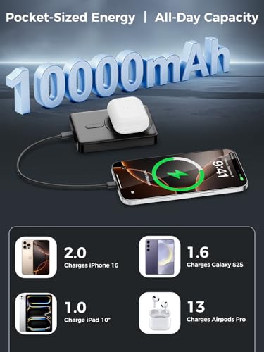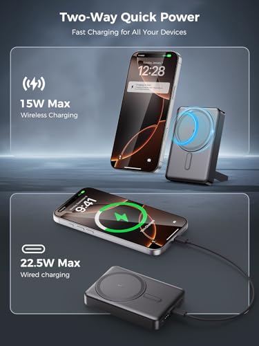10000mAh MagSafe wireless power bank with stand, 20W PD fast charging. Travel/hiking essential for iPhone 12-17 series.