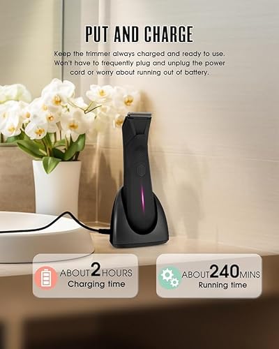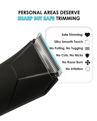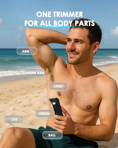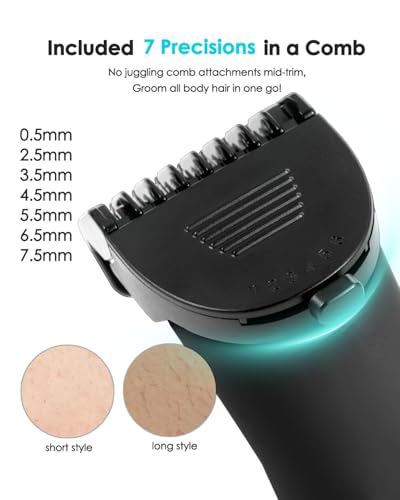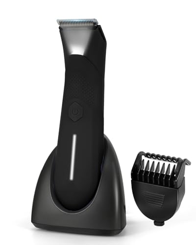Precise groin & body hair trimmer for men & women. Features light for visibility, 7 precision settings, waterproof wet/dry grooming, and long battery life.