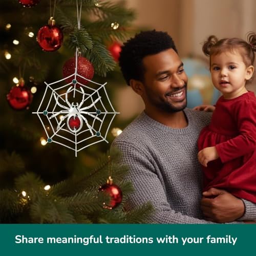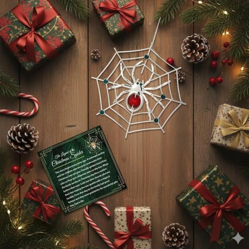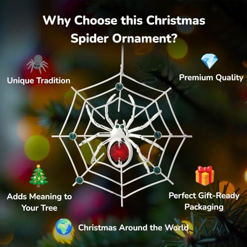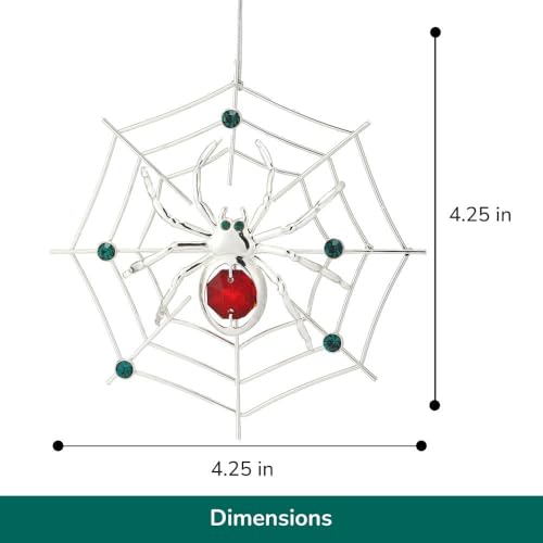 Elegant Matashi silver-plated spider ornament with red & green crystals. Perfect lucky hanging decoration for Christmas & Halloween. Includes tinsel legend story.