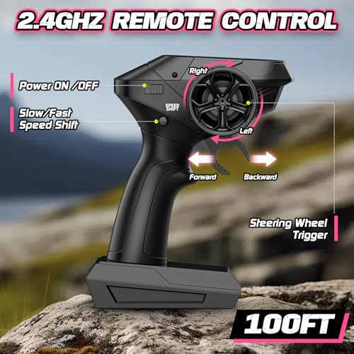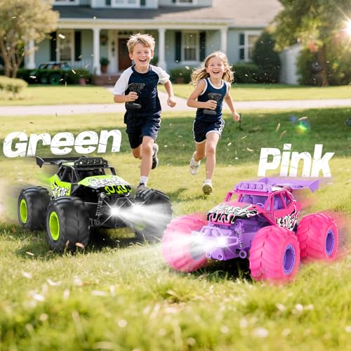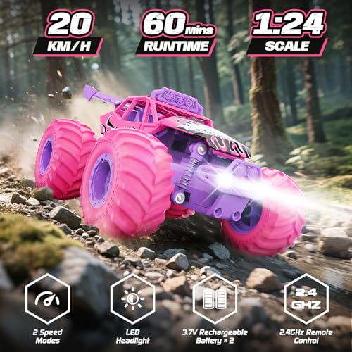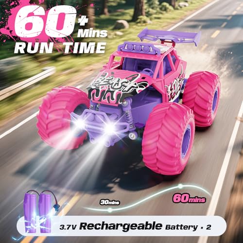 Explore with the Meislane pink all-terrain RC monster truck. Features LED headlights, speed switch & rechargeable batteries. Perfect gift for girls age 6-12.