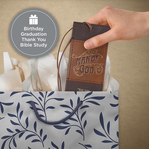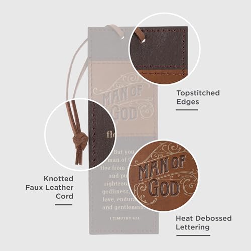 Premium vegan leather bookmark for men with “Man of God” scripture. Gold text, knotted cord, slim design. Light & dark brown, inspiring gift.