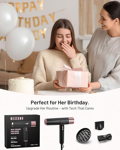 Achieve salon-quality results anywhere with the MESCOMB Dual Voltage Ionic Hair Dryer. Its powerful 1875W motor ensures high-speed drying for women, while advanced ionic technology eliminates frizz and prevents heat damage. Designed with a diffuser, it’s perfect for enhancing curls and adding volume. The lightweight, low-noise design ensures comfortable styling, and its dual voltage (110V-120V/220V-240V) makes it an essential for European and international travel. A thoughtful gift for women.