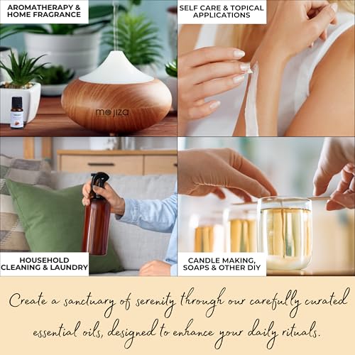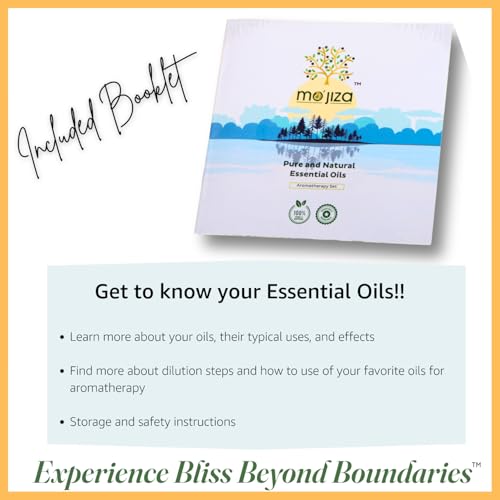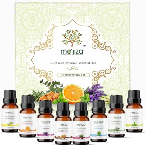 Embrace holistic wellness with the MO’JIZA Pure Aromatherapy Essential Oils Gift Set. This collection features eight 10ml bottles of premium, 100% pure essential oils: calming Lavender, purifying Tea Tree, invigorating Peppermint, grounding Frankincense, stimulating Rosemary, uplifting Sweet Orange, refreshing Lemongrass, and clarifying Eucalyptus. Each oil is certified Kosher, Vegan, and Cruelty-Free, ensuring ethical and high-quality aromatherapy for diffusion, topical application (diluted), and enhancing your natural lifestyle.