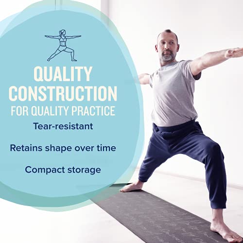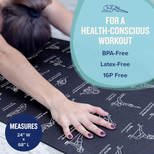 NewMe Fitness yoga mat for men & women. Large 68″, 5mm thick, non-slip, with 70 printed poses for Pilates, yoga, & home workouts.