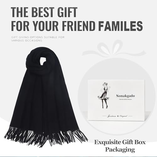 Elevate your winter wardrobe and evening attire with the Nonakgado Black Cashmere Scarf. This luxurious wool pashmina shawl offers exceptional warmth and a soft touch, making it an indispensable accessory for cold weather, sophisticated travel, or pairing with evening dresses. Its classic black color ensures timeless elegance and versatility, easily complementing any outfit for a refined look.