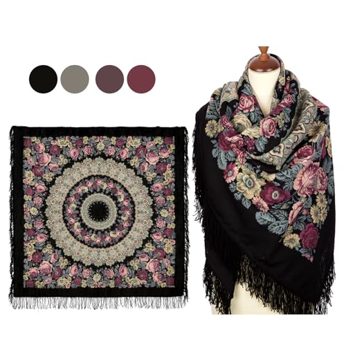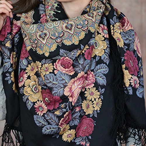 Embrace traditional Russian elegance with the Pavlovo Posad 100% Wool Shawl. This stunning 57.5×57.5” (146×146 cm) square shawl, in a captivating Prayer Black pattern, features beautiful woolen fringe. Crafted from pure wool, it offers exceptional warmth and a luxurious feel. Wear it as a headscarf, a chic shoulder wrap, or a statement fashion accessory, embodying a rich cultural heritage.