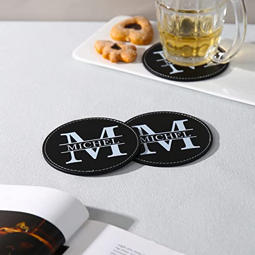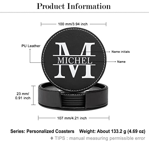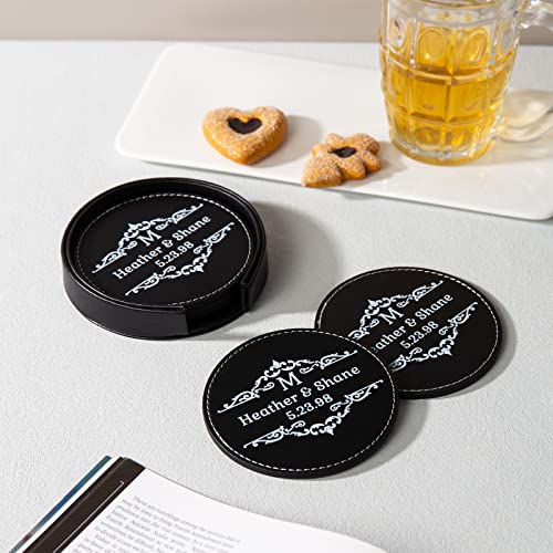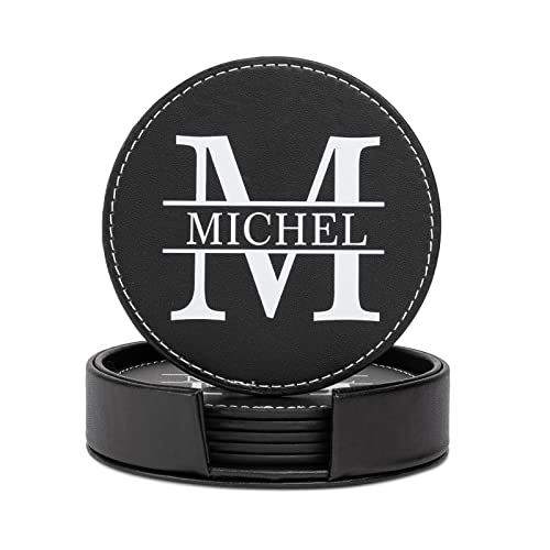 Personalized 5-pack leather coasters with holder. Custom name cup coasters perfect for kitchen, coffee table, or housewarming gifts.