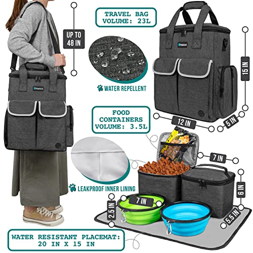 Organize pet essentials with PetAmi travel bag. Includes food containers, collapsible bowls, and feeding mat for dogs & cats. Perfect for trips.