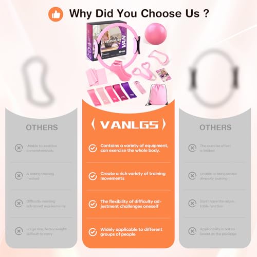 Transform your home workouts with the Vanlgs 13-piece Pilates Kit. Includes a 13″ ring, 10″ ball, and resistance bands. Perfect for beginners, women’s fitness.