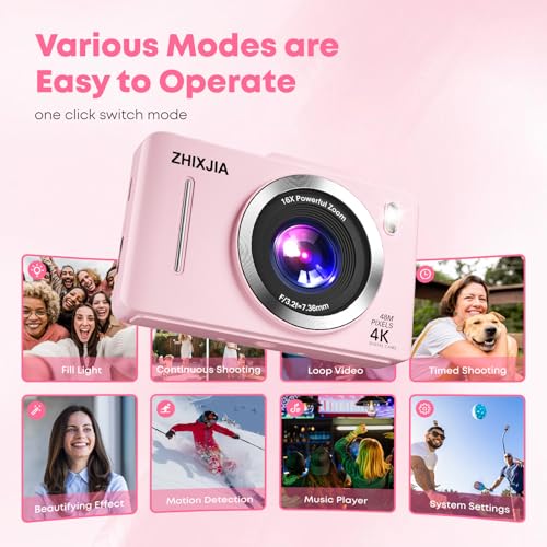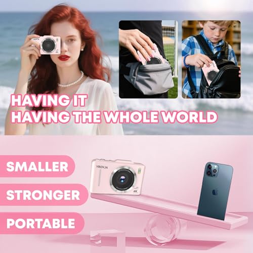 Discover the joy of photography and vlogging with our compact pink 4K digital camera. Designed for beginners, this point-and-shoot camera makes capturing high-quality videos and photos effortless. With advanced autofocus, 4K Full HD recording, and 16X digital zoom, every detail is crystal clear. The anti-shake feature ensures steady shots, even on the go. Portable and lightweight, it’s ideal for travel, daily vlogs, and family events. Comes complete with a 64GB memory card so you can start shooting right away. A perfect gift for aspiring photographers and content creators.