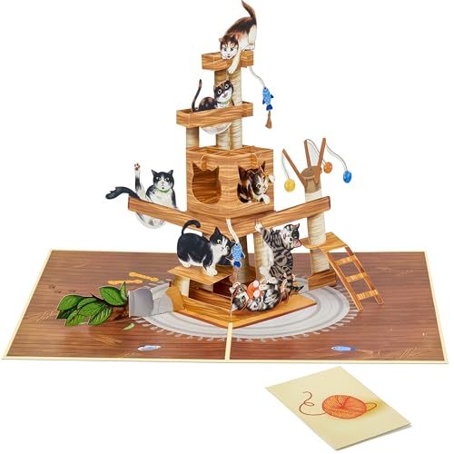 Unique 5×7 POPWOW 3D Cat Tree Pop Up Card with funny cats. Perfect greeting card for birthdays, Valentine’s, Mother’s/Father’s Day, or any cat person. Includes envelope.